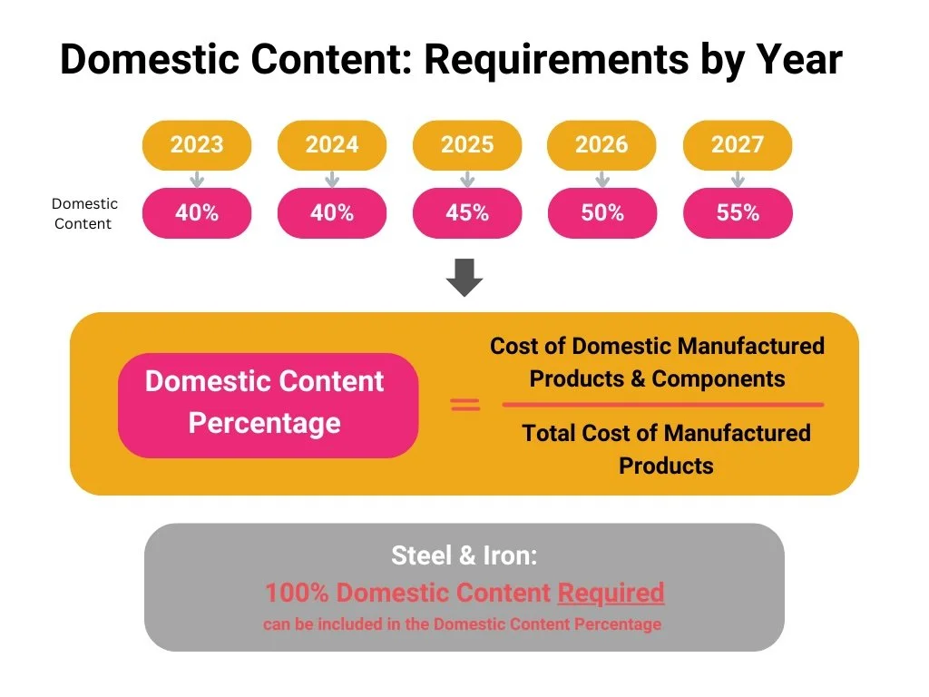 We have some clarification on what is required to qualify for the domestic content adder. First, any steel and iron used in the racking for the project must be made in the US. Additionally, the total domestic content percentage must meet the increasing scale of minimum domestic content requirements (below), starting at 40% in 2023 and rising to 55% by 2027. The total domestic content percentage can be calculated by dividing the cost of domestically manufactured products and components used in a project by the total cost of materials (both domestically and internationally manufactured). The cost of US-manufactured steel and iron can be included in this calculation, which, given the price of steel, makes most canopy projects eligible for this adder.